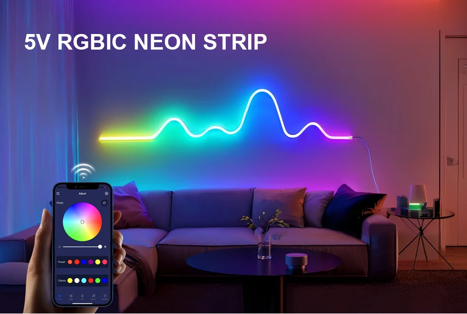 Bluetooth RGBIC WS2812 5V Dream Color RGB LED Neon lights Waterproof Soft Tube Flexible Dimmable Ribbon Tape Lamp TV Room Decor