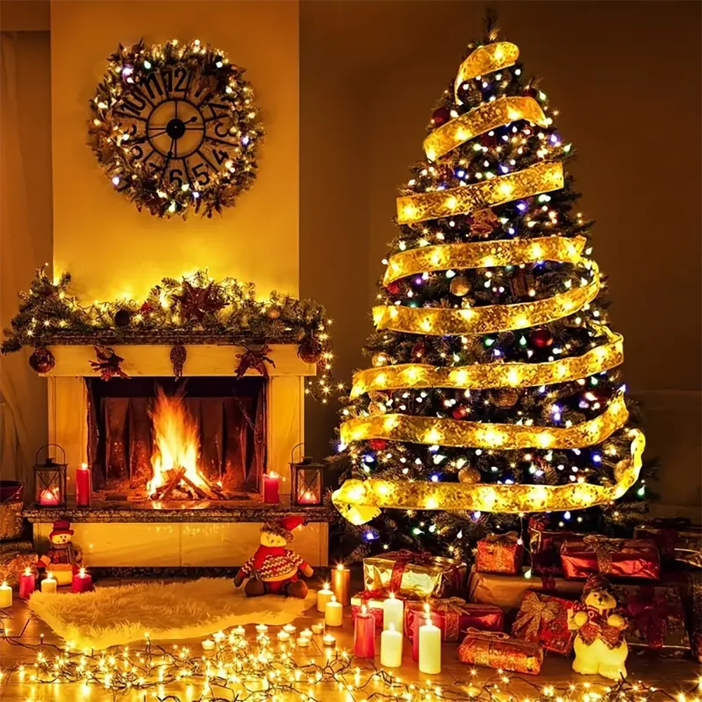 🎄【Romantic Decoration】Beautiful double decorated Christmas tree fairy lights. Gold indoor and outdoor Christmas ribbon with warm yellow lights creating a festive atmosphere for the holiday season, perfect for decorating your yard, garden, room, ladder, wedding, Christmas tree and party.